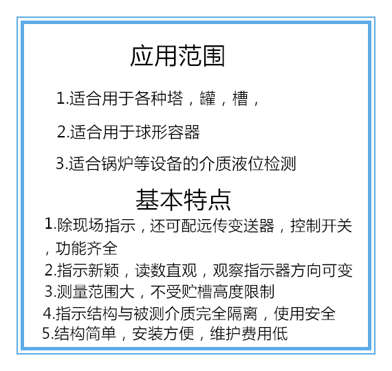 2、被測介質與指示結構完全隔離,密封性能好,防泄露、適應高壓、 高溫、腐蝕條件下的液位測量,可靠性高。