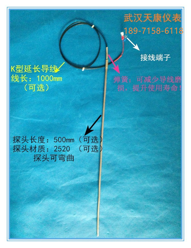 采用熱電偶測溫 探頭 分度號: K 型號: TKWRNK-196 探頭長度: 500mm 探頭直徑: 6*500*1000mm 保護管材質: 2520(1050℃)、可選高溫材質 鐵氟龍屏蔽感溫線長: 1米 測溫范圍: 0-1050℃ 可訂制,詳情請聯(lián)系:189-7158-6118