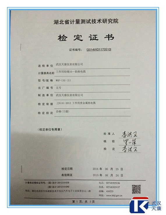 省計(jì)量局鑒定證書(下圖)