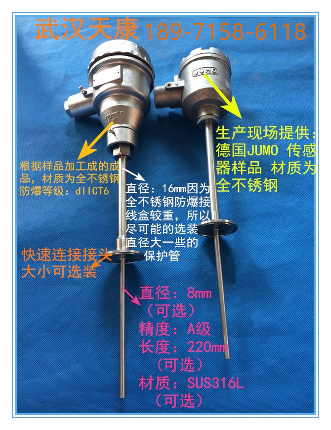 采用感溫元件 優(yōu)質(zhì)接線盒,優(yōu)質(zhì)不銹鋼保護(hù)管 型號(hào):WZPK-448S 分度號(hào):PT100 保護(hù)管長(zhǎng)度:370/220 保護(hù)管直徑:16/8mm 安裝方式:快接法蘭 測(cè)溫范圍:-50-+400℃